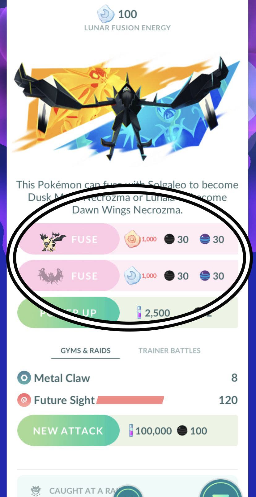 لاستخدام Fusion في Pokémon Go، عليك أولاً التأكد من أن لديك Necrozma وSolgaleo أو Lunala. (إنها فكرة جيدة أن يكون لديك كل من Solgaleo وLunala لضمان حصولك على كلا شكلي Necrosma.) بدون اثنين على الأقل من هؤلاء البوكيمون، يجب أن يكون أحدهما Necrosma، مما لا يترك لك أي فرصة لإنشاء مخلوق جديد. انصهار.
