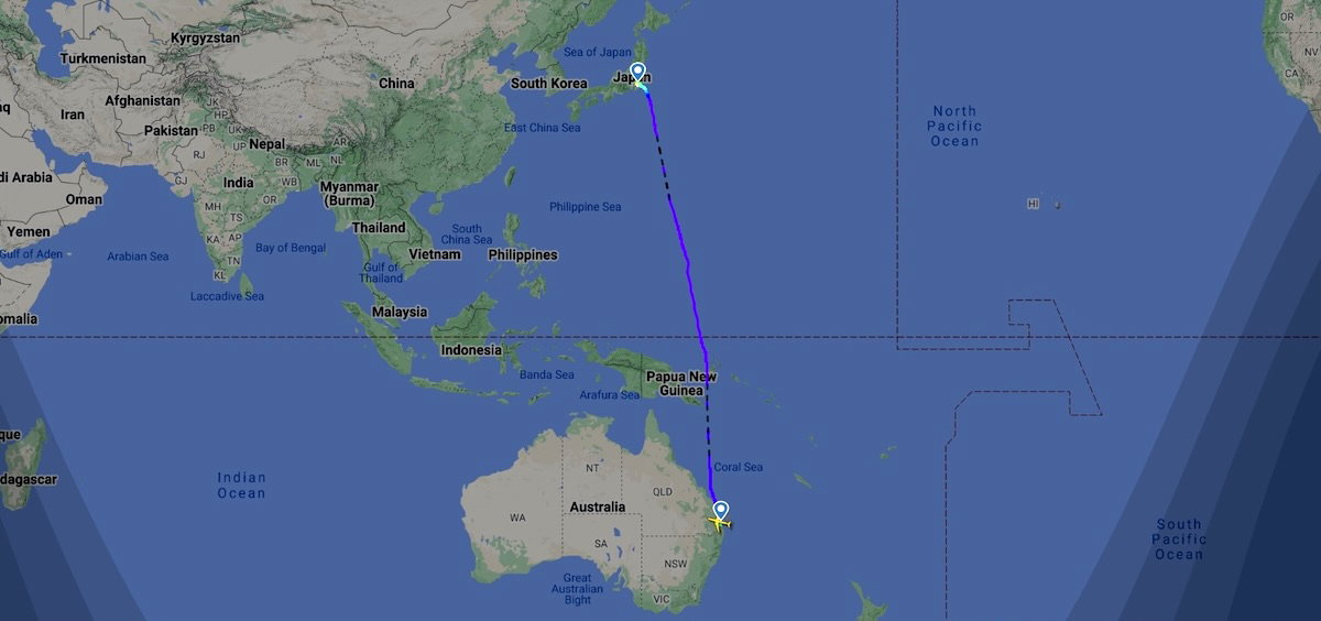 تغادر الرحلة عادةً من أوكلاند في الساعة 10:05 صباحًا وتصل إلى طوكيو في الساعة 6:05 مساءً، وتستغرق الرحلة حوالي 10 ساعات و30 دقيقة. في هذه الحالة، قامت شركة الطيران أولاً برحلة مدتها ساعتين و58 دقيقة إلى بريسبان ثم رحلة مدتها 8 ساعات و6 دقائق إلى طوكيو. وبدلاً من الوصول الساعة 6:05 مساءً، وصلت الرحلة الساعة 8:21 مساءً.