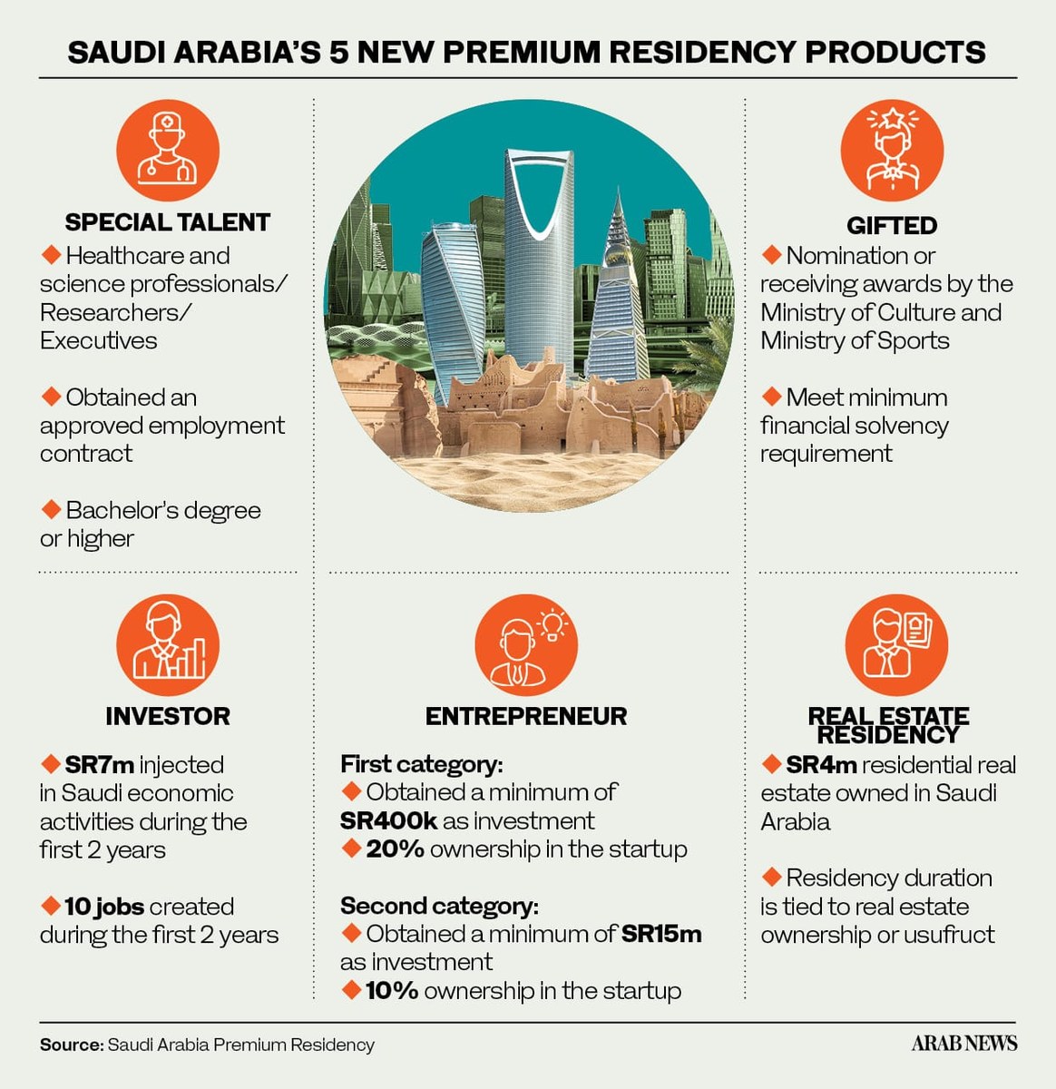 يتم تشغيل منتجات الإقامة، ولكل منها متطلبات أهلية خاصة بها، ضمن فئات مثل المهارات الخاصة، والمهارات، والمستثمر، ورواد الأعمال، ومالك العقارات. تم تحديد رسوم الطلب لمرة واحدة لكل فئة بمبلغ 4000 ريال سعودي (1066 دولارًا).